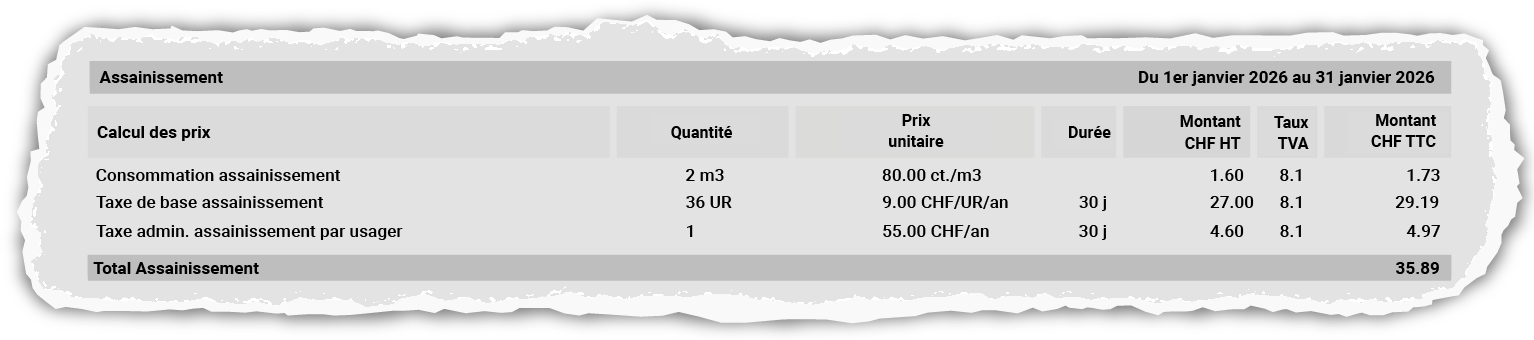 | Taxe de base assainissement | Il s’agit d’une taxe annuelle fixe facturée par logement pour l’assainissement. |