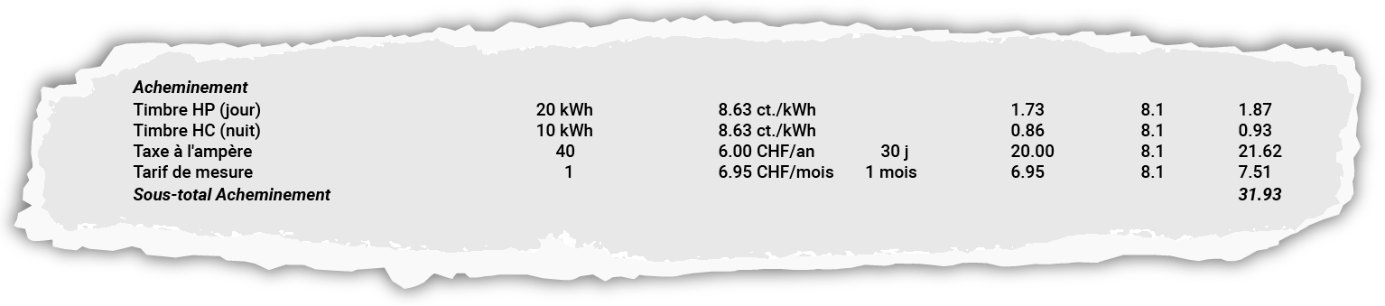 | Swissgrid Services-système | Représente la taxe fédérale qui permet d’entretenir le réseau de transport de haute tension. |