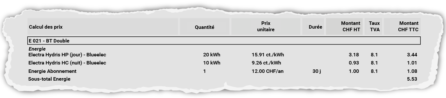 | Sous-total Energie | Prix total TTC de l’électricité sans les coûts de l’acheminement et les redevances. |