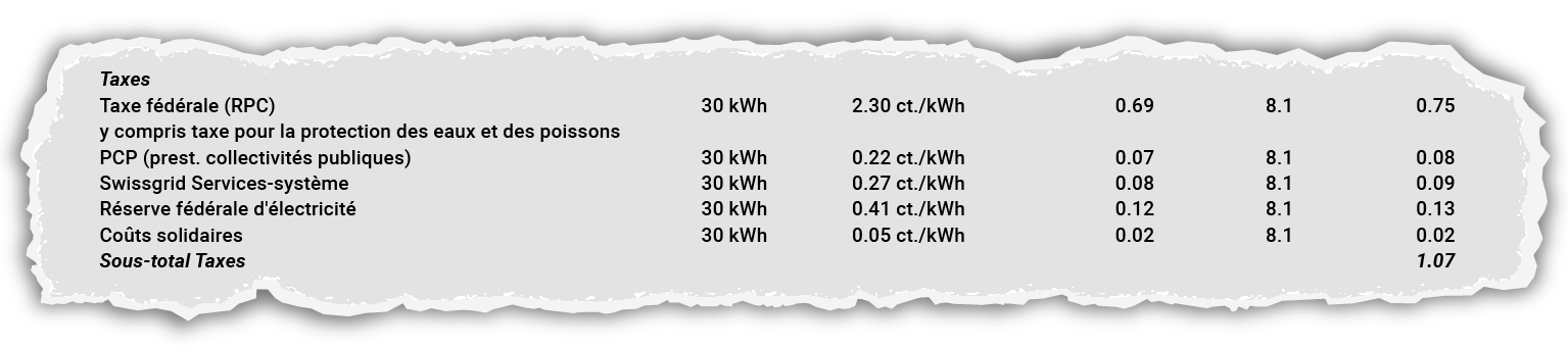 Les taxes communales, cantonales et fédérales sont la dernière composante tarifaire d’une facture d’énergie. Ces taxes sont fixées par les autorités compétentes, puis redistribuées en l’état.